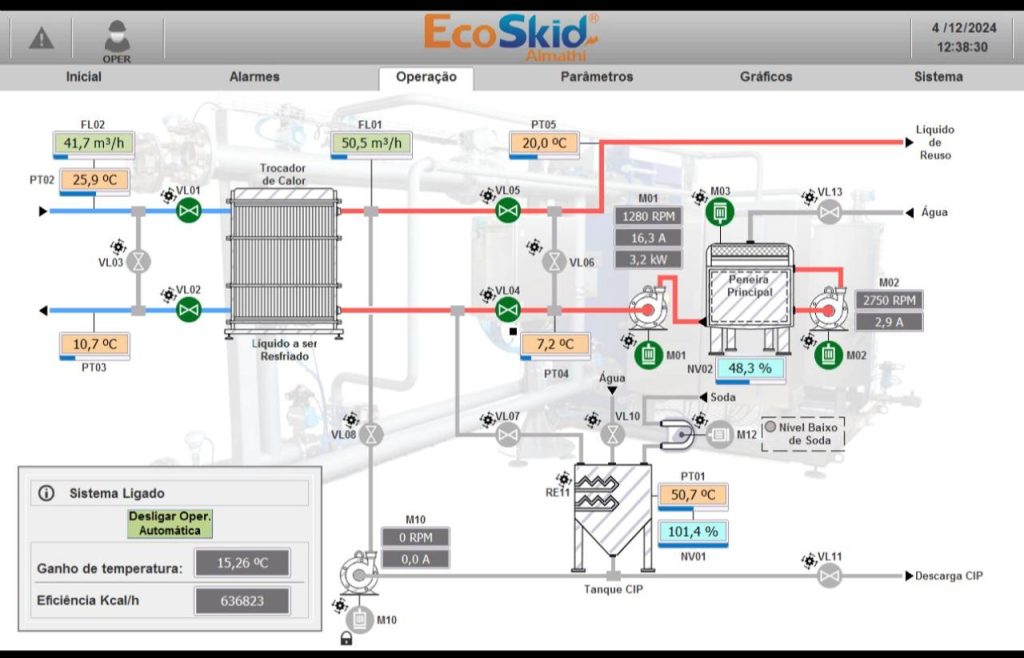 O sistema EcoSkid usa a energia dessa água descartada e reduz a temperatura da água que será pré-resfriada, antes dos trocadores de NH3 da sala de máquinas.